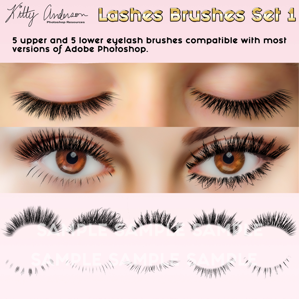 Great lashes add a pop of glamour and style to your creations. This set of 10 Photoshop brushes allows you to easily apply beautiful, long lashes to your work.